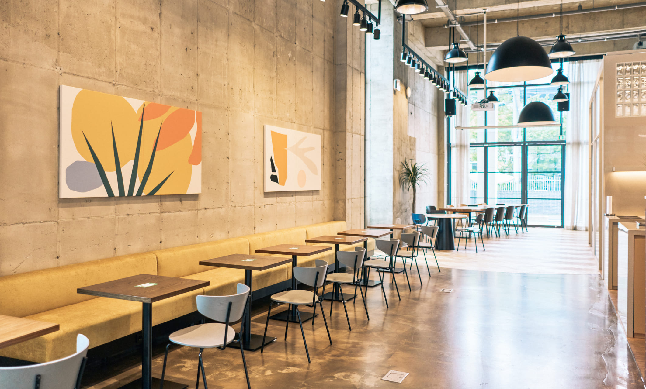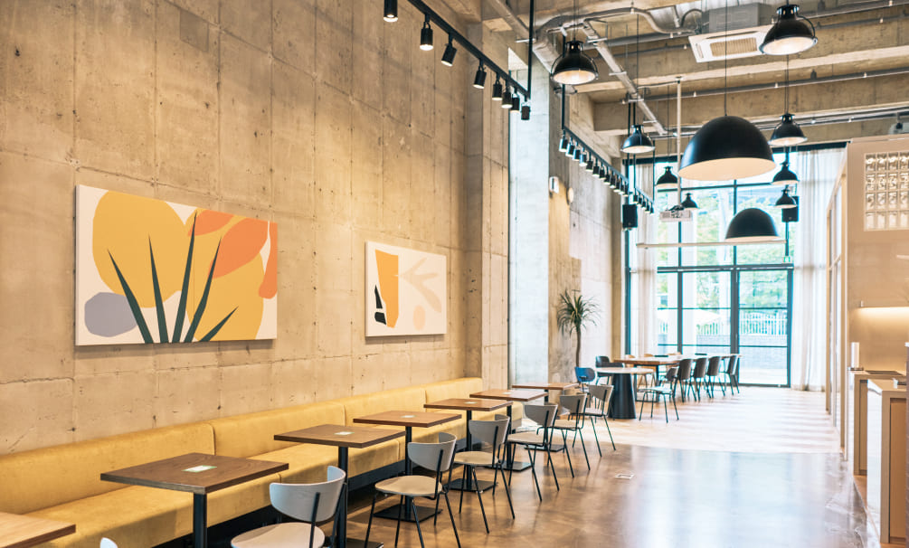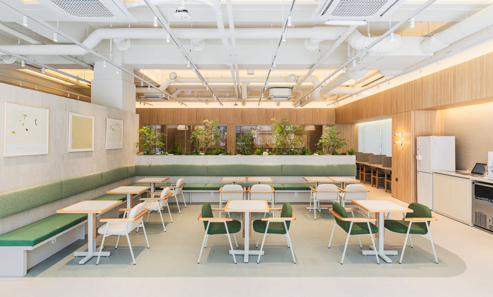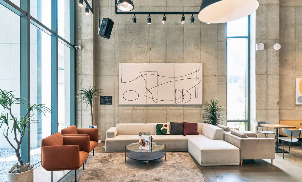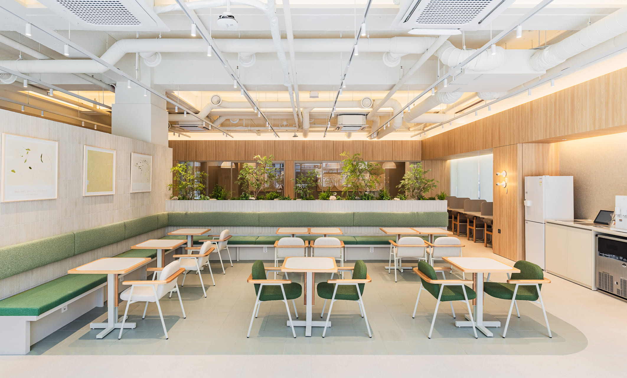 크게 세 가지입니다. 첫 번째는 건물의 특성이에요. 사무실 레이아웃을 결정하는 가장 중요한 요인인데, 건물을 보면서 공간 디자인의 아이디어를 많이 얻기도 하거든요. 예를 들어 압구정점의 경우, 건물 외관이 태양광 패널로 덮여 있다는 특징이 있는데요. 패널이라는 특성에서 모듈이라는 컨셉을 차용했고, 친환경이라는 컨셉에서 코트야드 스타일을 도출해 내 스토리를 부여했어요. 그 덕분에 건물과 내부 인테리어의 통일감을 부여할 수 있었죠.