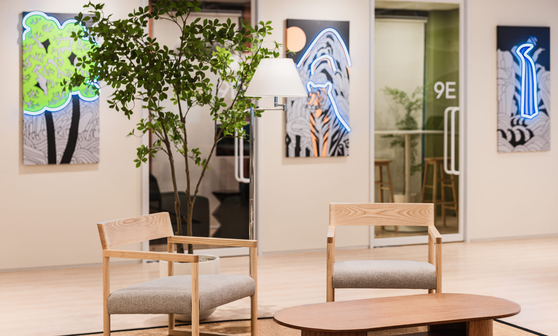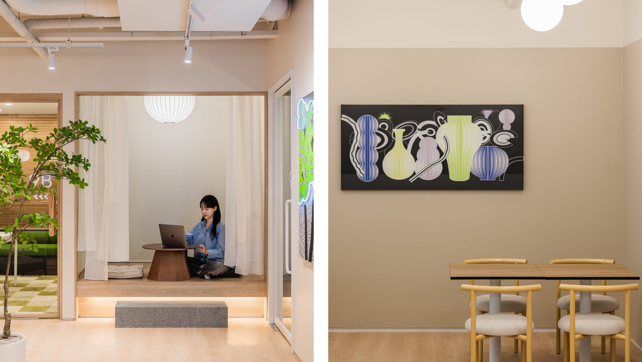강남점은 한마디로 '가장 한국적인 것이 가장 현대적이다'라는 말을 실감할 수 있는 공간이에요. 베이지와 우드의 차분함을 베이스로 다양한 소재를 사용했는데요. 이를 통해 동양적인 선의 미학을 오피스에 녹여냈죠. 또 낮에는 자연광 밤에는 조명이 조화롭게 어우러지도록 빛이 만들어내는 분위기를 세심하게 고려했습니다.