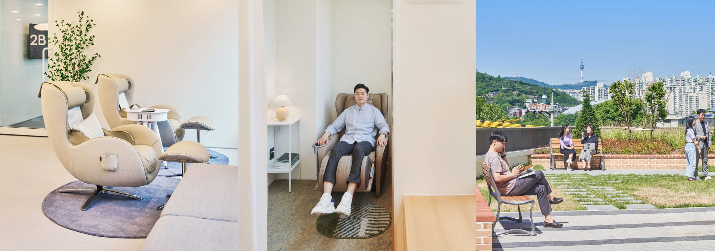 고급 안마의자가 준비된 리차징존, 잠시 숨 고를 수 있는 테라스 등 프리미엄 오피스 패파에서 편안한 휴식 공간을 경험하세요